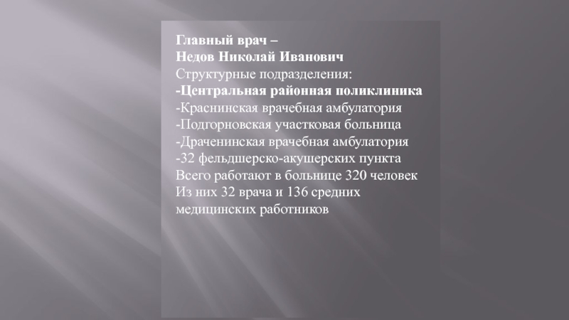 Главный врач – Недов Николай ИвановичСтруктурные подразделения:-Центральная районная поликлиника-Краснинская врачебная амбулатория-Подгорновская участковая больница-Драченинская врачебная амбулатория-32 фельдшерско-акушерских пунктаВсего работают в больнице 320 человекИз них 32 врача и 136 средних медицинских работников