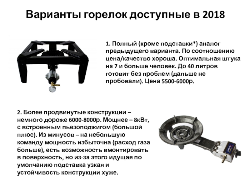 2. Более продвинутые конструкции – немного дороже 6000-8000р. Мощнее – 8кВт, с встроенным пьезоподжигом (большой плюс). Из минусов – на небольшую команду мощность избыточна (расход газа больше), есть возможность вмонтировать в поверхность, но из-за этого идущая по умолчанию подставка узкая и устойчивость конструкции хуже.