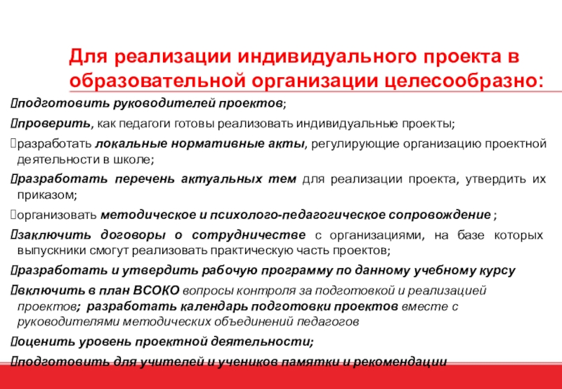 включить в план ВСОКО вопросы контроля за подготовкой и реализацией проектов; разработать календарь подготовки проектов вместе с руководителями методических объединений педагогов