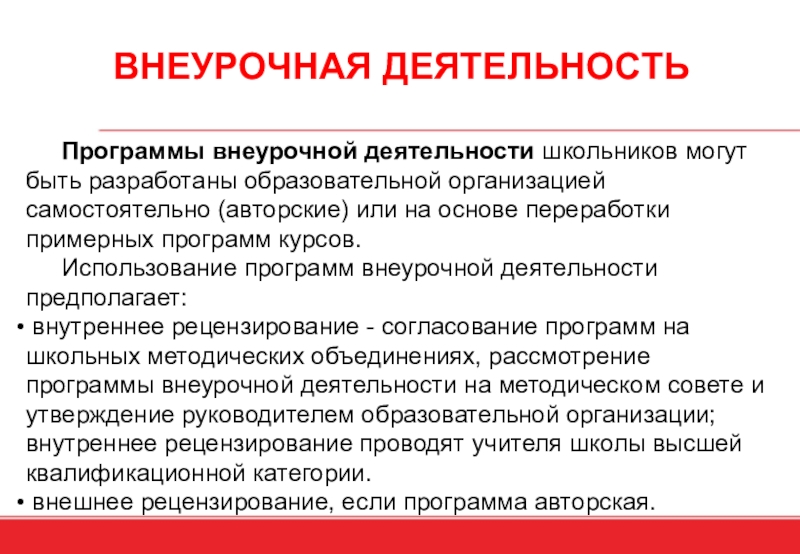внутреннее рецензирование - согласование программ на школьных методических объединениях, рассмотрение программы внеурочной деятельности на методическом совете и утверждение руководителем образовательной организации; внутреннее рецензирование проводят учителя школы высшей квалификационной категории.