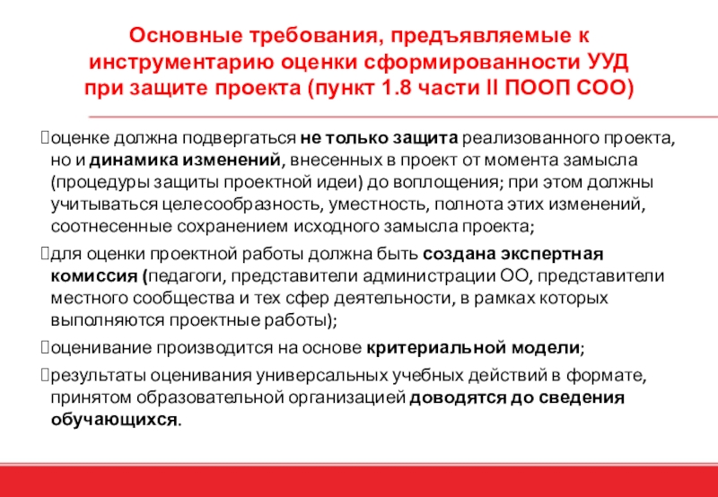 Слайд 24Основные требования, предъявляемые к инструментарию оценки сформированности УУД при защите