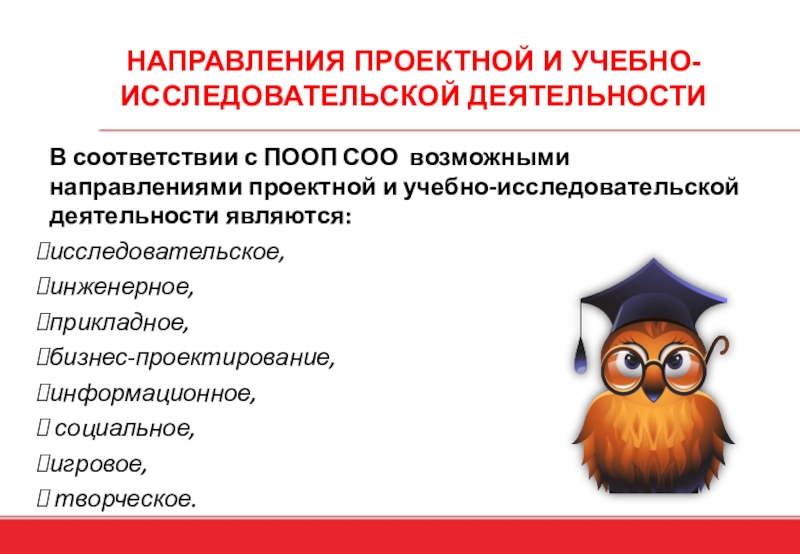 Слайд 17НАПРАВЛЕНИЯ ПРОЕКТНОЙ И УЧЕБНО-ИССЛЕДОВАТЕЛЬСКОЙ ДЕЯТЕЛЬНОСТИ