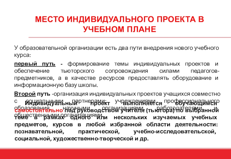 Второй путь -организация индивидуальных проектов учащихся совместно с социальными партнерами: учреждениями профессионального образования, научными организациями, работодателями и общественными организациями.