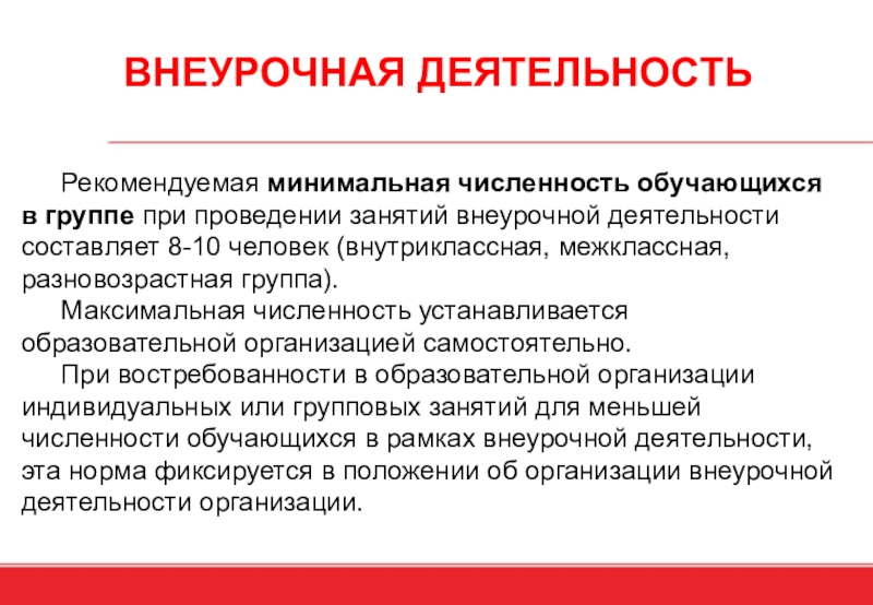 внеурочной деятельности составляет 8-10 человек (внутриклассная, межклассная, разновозрастная группа).