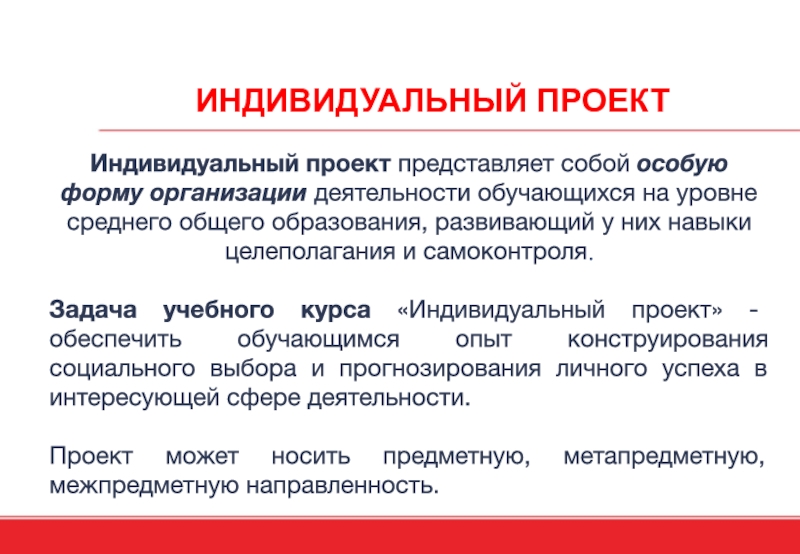 Задача учебного курса «Индивидуальный проект» - обеспечить обучающимся опыт конструирования социального выбора и прогнозирования личного успеха в интересующей сфере деятельности.