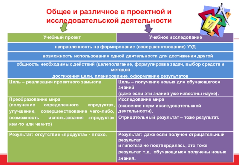 Слайд 18Общее и различное в проектной и исследовательской деятельности