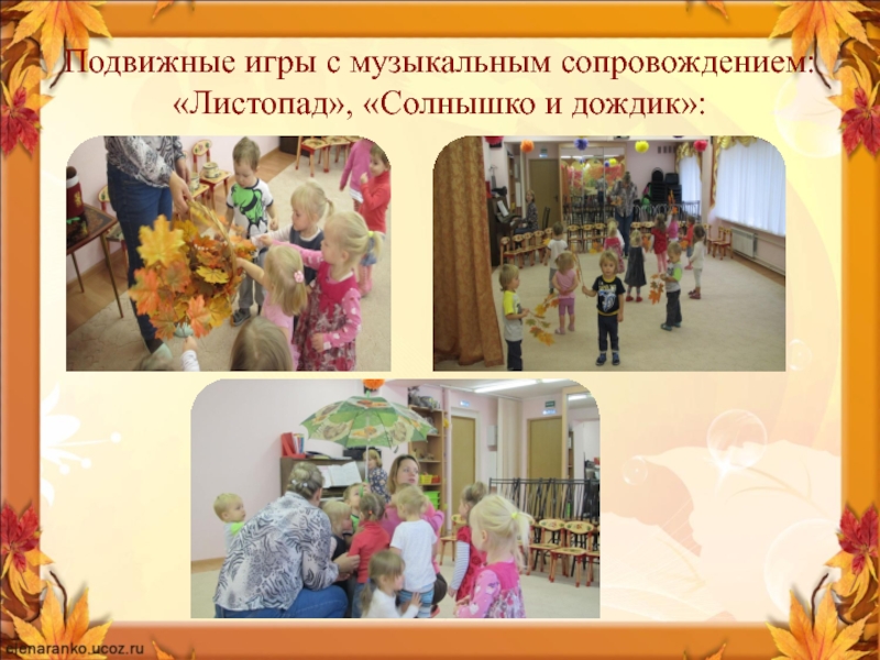 Слайд 16Подвижные игры с музыкальным сопровождением: «Листопад», «Солнышко и дождик»: