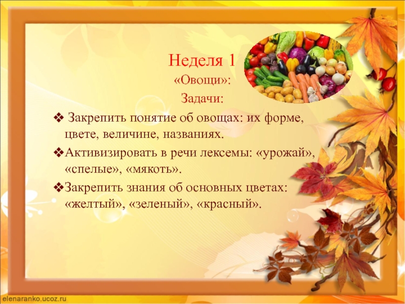 Неделя 1«Овощи»:Задачи: Закрепить понятие об овощах: их форме, цвете, величине, названиях.Активизировать в речи лексемы: «урожай», «спелые», «мякоть».Закрепить