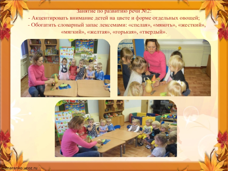 Занятие по развитию речи №2: - Акцентировать внимание детей на цвете и форме отдельных овощей;