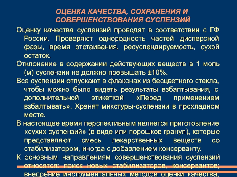 К основным направлениям совершенствования суспензий относятся: поиск новых стабилизаторов, консервантов; внедрение инструментальных методов оценки качества; разработка средств малой механизации.