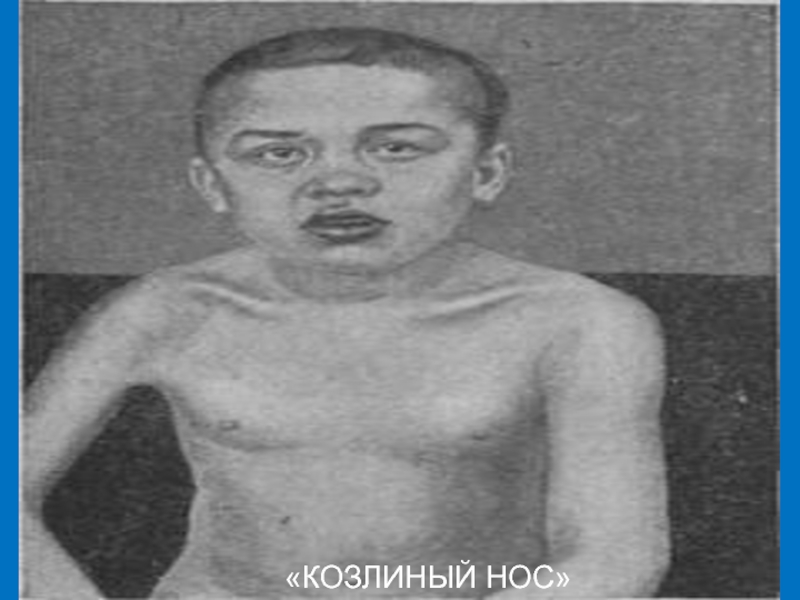 Седловидный или «козлиный» нос – результат разрушения носовой перегородки и хряща при специфическом рините. На слизистой оболочке носа нередко наблюдается характерное хр. поражение в виде озены (зловонный насморк).