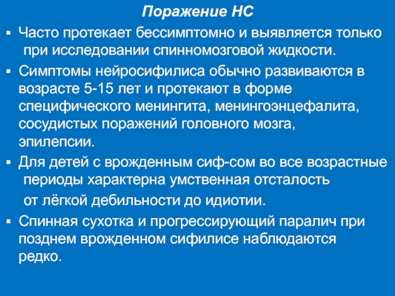 Симптомы нейросифилиса обычно развиваются в возрасте 5-15 лет и