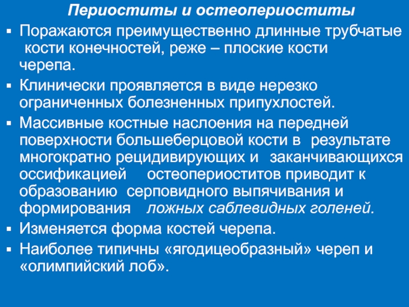 Поражаются надкостница, кости и суставы голеней, предплечий, черепа, коленные, локтевые и голеностопные суставы.