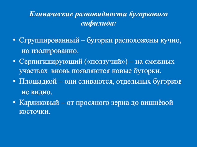 Слайд 7Клинические разновидности бугоркового сифилида: