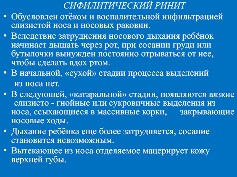 Это приводит к тяжелым расстройствам речи, глотания, дыхания, изменяется внешний вид б-го («седловидный» нос, полное разрушение носа, перфорации твёрдого неба).