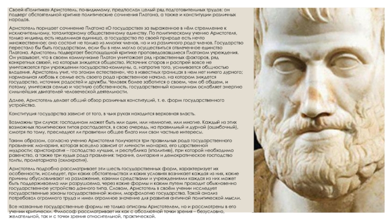порицает сочинение Платона «О государстве» за выраженное в нём стремление к исключительному, тоталитарному общественному единству. По политическому учению Аристотеля, только индивид есть неделимая единица, а государство по своей природе есть нечто множественное; оно состоит не только из многих членов, но и из различного рода членов. Государство перестало бы быть государством, если бы в нем могло осуществиться отвлеченное единство Платона. Аристотель подвергает беспощадной критике проповедовавшиеся Платоном учреждения. Он указывает, что в своем коммунизме Платон уничтожает ряд нравственных факторов, ряд конкретных связей, на которых зиждется общество. Источник споров и распрей вовсе не уничтожается при учреждении государства-коммуны, а, напротив того, усиливается общностью владения. Аристотель учит, что эгоизм естественен, что в известных границах в нем нет ничего дурного; нормальная любовь к семье есть своего рода нравственное начало, на котором зиждется государство, источник радостей и дружбы. Человек более заботится о своем, чем об общем, и потому, уничтожая семью и частную собственность, государственный коммунизм ослабляет энергию сильнейших двигателей человеческой деятельности.