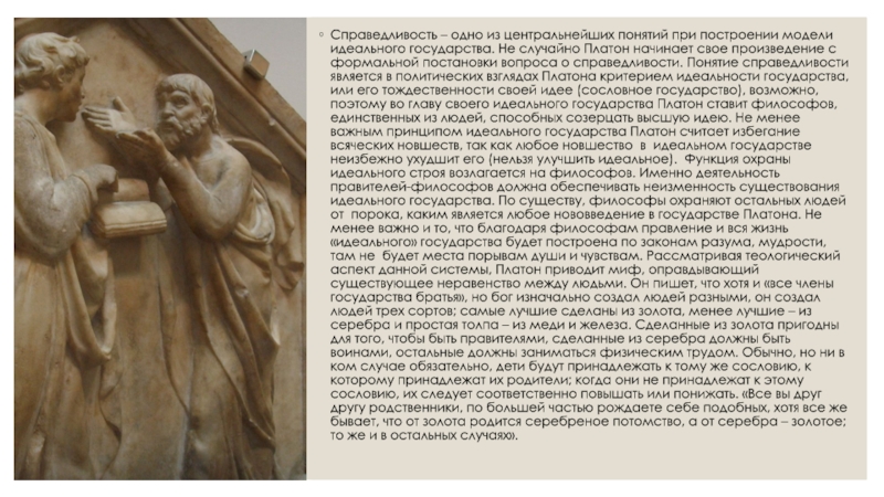 вопроса о справедливости. Понятие справедливости является в политических взглядах Платона критерием идеальности государства, или его тождественности своей идее (сословное государство), возможно, поэтому во главу своего идеального государства Платон ставит философов, единственных из людей, способных созерцать высшую идею. Не менее важным принципом идеального государства Платон считает избегание всяческих новшеств, так как любое новшество в идеальном государстве неизбежно ухудшит его (нельзя улучшить идеальное). Функция охраны идеального строя возлагается на философов. Именно деятельность правителей-философов должна обеспечивать неизменность существования идеального государства. По существу, философы охраняют остальных людей от порока, каким является любое нововведение в государстве Платона. Не менее важно и то, что благодаря философам правление и вся жизнь «идеального» государства будет построена по законам разума, мудрости, там не будет места порывам души и чувствам. Рассматривая теологический аспект данной системы, Платон приводит миф, оправдывающий существующее неравенство между людьми. Он пишет, что хотя и «все члены государства братья», но бог изначально создал людей разными, он создал людей трех сортов; самые лучшие сделаны из золота, менее лучшие – из серебра и простая толпа – из меди и железа. Сделанные из золота пригодны для того, чтобы быть правителями, сделанные из серебра должны быть воинами, остальные должны заниматься физическим трудом. Обычно, но ни в ком случае обязательно, дети будут принадлежать к тому же сословию, к которому принадлежат их родители; когда они не принадлежат к этому сословию, их следует соответственно повышать или понижать. «Все вы друг другу родственники, по большей частью рождаете себе подобных, хотя все же бывает, что от золота родится серебреное потомство, а от серебра – золотое; то же и в остальных случаях».