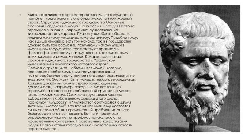 Слайд 12Миф заканчивается предостережением, что государство погибнет, когда охранять его будет железный