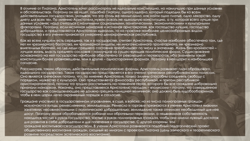 одного идеала, который подходил бы ко всем действительным государствам, указывая, что это столь же немыслимо, как найти одно платье, одно лекарство, одну диету для всех тел. По мнению Аристотеля, нужно искать не идеальную конституцию, а ту, которая всего лучше при данных условиях; надо считаться с наличными социальными, политическими, экономическими и культурными факторами. Поэтому, если истинная монархия и истинная аристократия, как господство лучших, господство добродетели, и представляются Аристотелю идеалом, то на практике наиболее целесообразным видом государства в его учении признается умеренно-демократическая республика.