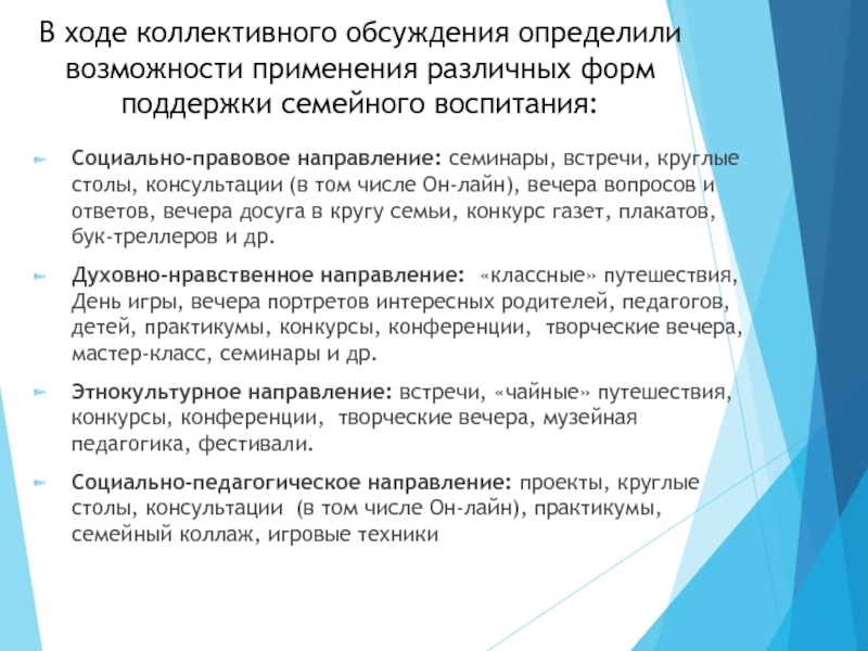 Социально-педагогическое направление: проекты, круглые столы, консультации (в том числе Он-лайн), практикумы, семейный коллаж, игровые техники