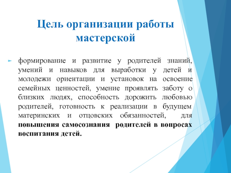 и установок на освоение семейных ценностей, умение проявлять заботу о близких людях, способность дорожить любовью родителей, готовность к реализации в будущем материнских и отцовских обязанностей, для повышения самосознания родителей в вопросах воспитания детей.