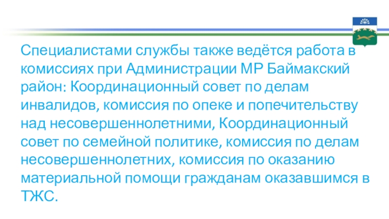 Слайд 43Специалистами службы также ведётся работа в комиссиях при Администрации МР