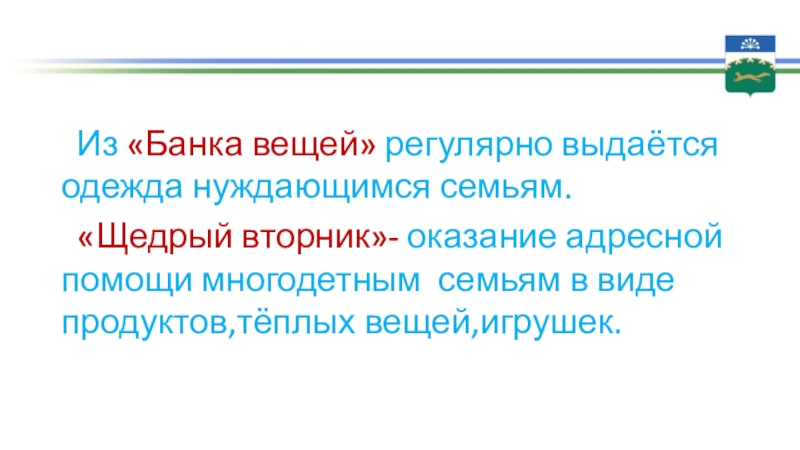Слайд 33 Из «Банка вещей» регулярно выдаётся одежда нуждающимся семьям.