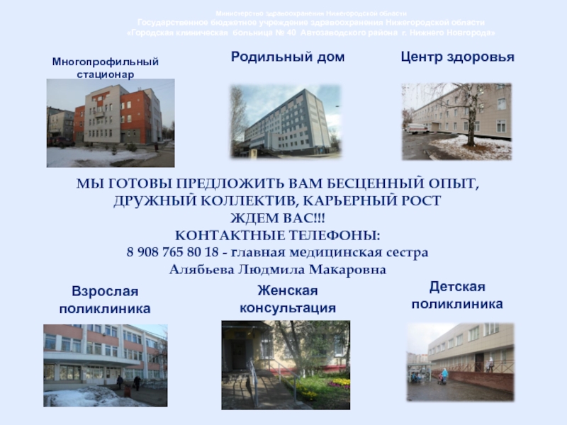 Новгороде многопрофильный медицинский комплекс, включающий в себя стационар, Областной перинатальный центр, женскую консультацию, детскую и взрослую поликлиники. Сегодня это крупное государственное лечебно-профилактическое учреждение является основной клинической базой кафедры хирургии Центра повышения квалификации и профессиональной переподготовки специалистов Нижегородской государственной медицинской академии, которая работает на базе больницы со дня ее открытия. Функциональная особенность больницы N 40 – прием пациентов практически с любой патологи ей в экстренных случаях и в круглосуточном режиме.БУДЕМ РАДЫ ВИДЕТЬ ВАС В НАШЕМ УЧРЕЖДЕНИИ