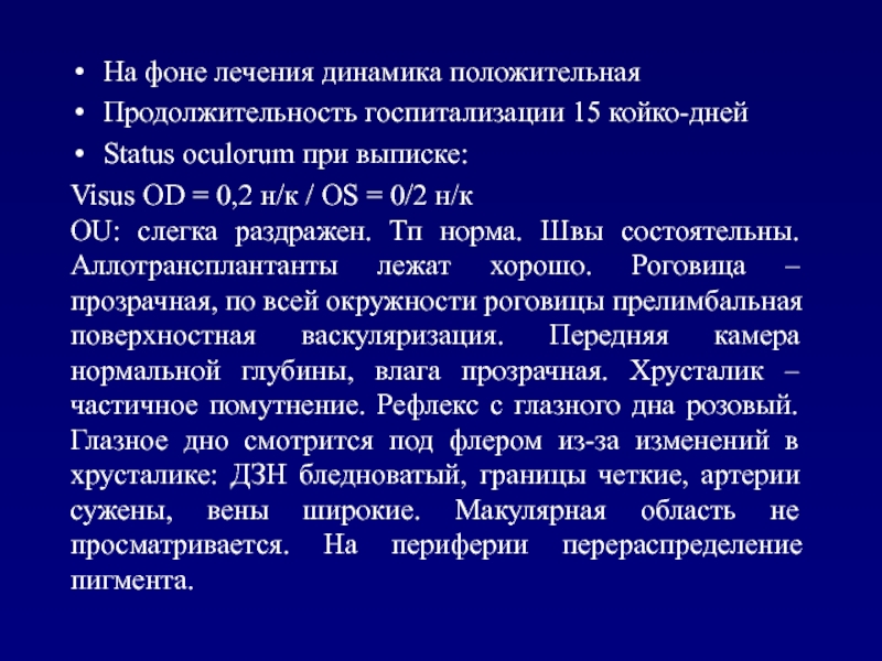 слегка раздражен. Тп норма. Швы состоятельны. Аллотрансплантанты лежат хорошо. Роговица – прозрачная, по всей окружности роговицы прелимбальная поверхностная васкуляризация. Передняя камера нормальной глубины, влага прозрачная. Хрусталик – частичное помутнение. Рефлекс с глазного дна розовый. Глазное дно смотрится под флером из-за изменений в хрусталике: ДЗН бледноватый, границы четкие, артерии сужены, вены широкие. Макулярная область не просматривается. На периферии перераспределение пигмента.