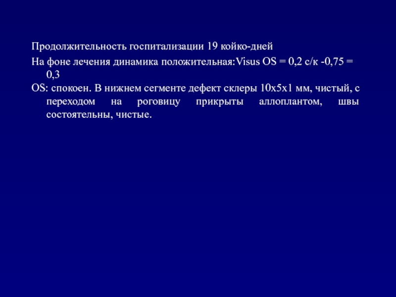 склеры 10х5х1 мм, чистый, с переходом на роговицу прикрыты аллоплантом, швы состоятельны, чистые.