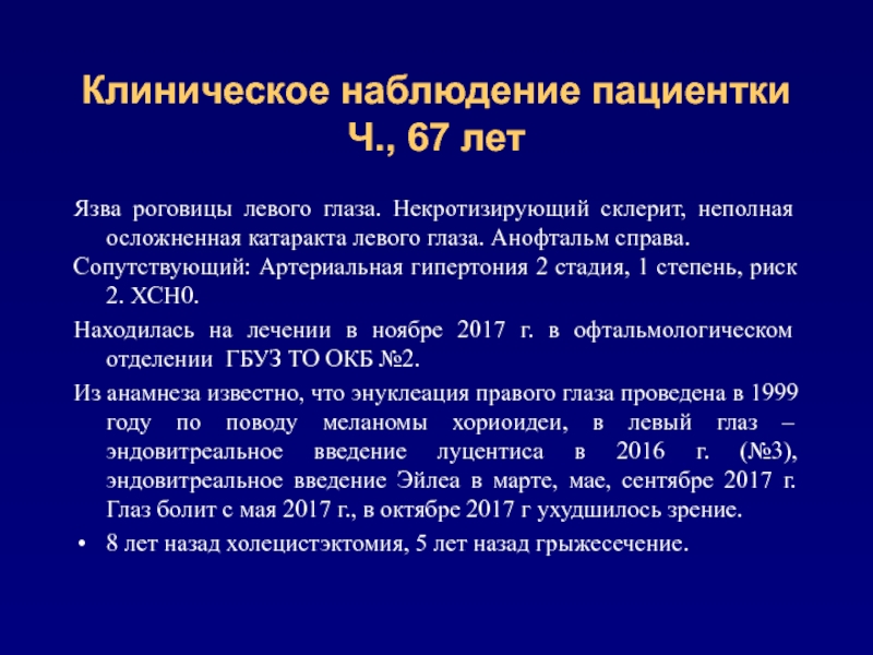 Слайд 15Клиническое наблюдение пациентки Ч., 67 лет
