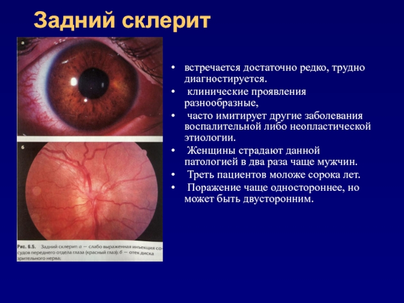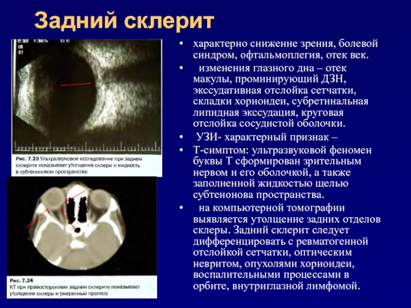 на компьютерной томографии выявляется утолщение задних отделов склеры. Задний склерит следует дифференцировать с ревматогенной отслойкой сетчатки, оптическим невритом, опухолями хориоидеи, воспалительными процессами в орбите, внутриглазной лимфомой.