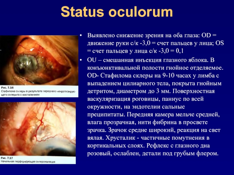 OU – смешанная инъекция глазного яблока. В конъюнктивальной полости гнойное отделяемое. OD- Стафилома склеры на 9-10 часах у лимба с выпадением цилиарного тела, покрыта гнойным детритом, диаметром до 3 мм. Поверхностная васкуляризация роговицы, паннус по всей окружности, на эндотелии сальные преципитаты. Передняя камера мельче средней, влага прозрачная, нити фибрина в просвете зрачка. Зрачок средне широкий, реакция на свет вялая. Хрусталик - частичные помутнения в кортикальных слоях. Рефлекс с глазного дна розовый, ослаблен, детали под грубым флером.