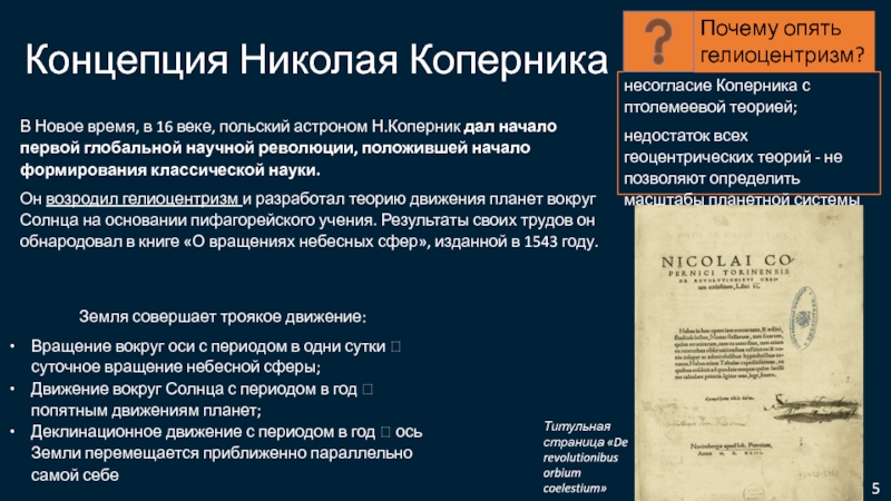 Он возродил гелиоцентризм и разработал теорию движения планет вокруг Солнца на основании пифагорейского учения. Результаты своих трудов он обнародовал в книге «О вращениях небесных сфер», изданной в 1543 году.