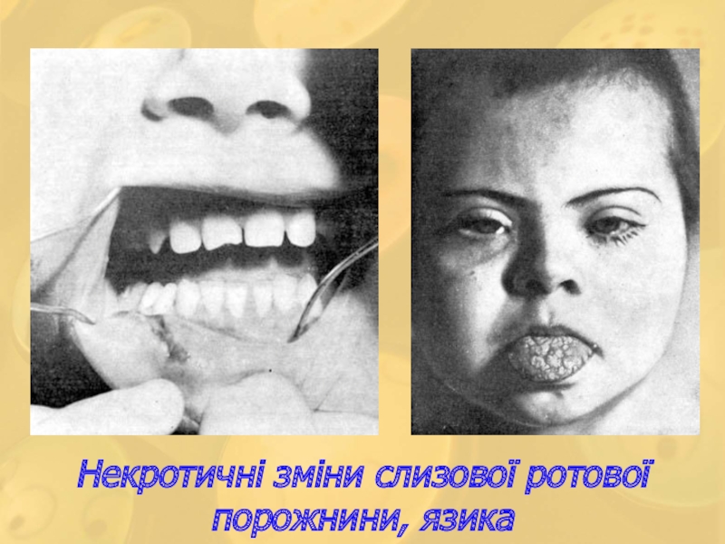 Слайд 15Некротичні зміни слизової ротової порожнини, язика