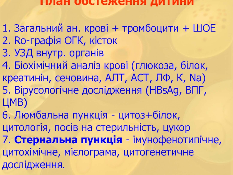 7. Стернальна пункція - імунофенотипічне, цитохімічне, мієлограма, цитогенетичне дослідження.