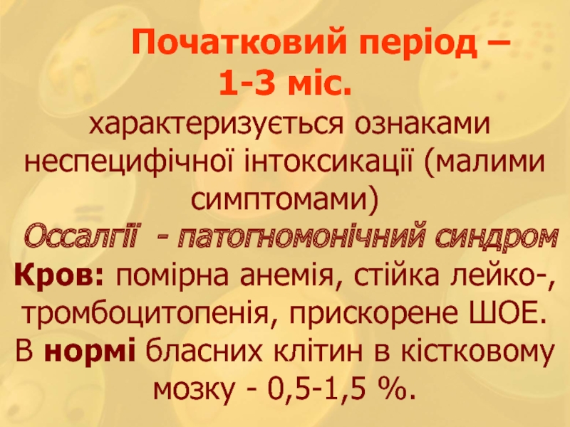 виникає з кровотворної клітини і пошкоджуює в першу чергу кістковий