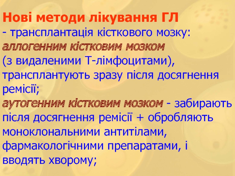 - забирають після досягнення ремісії + обробляють моноклональними антитілами, фармакологічними препаратами, і вводять хворому;