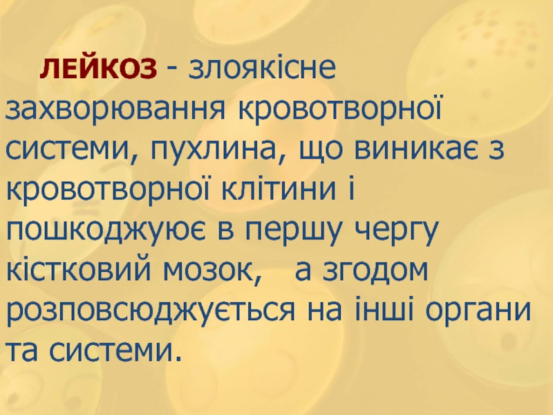 ЛЕЙКОЗ - злоякісне захворювання кровотворної системи, пухлина, що