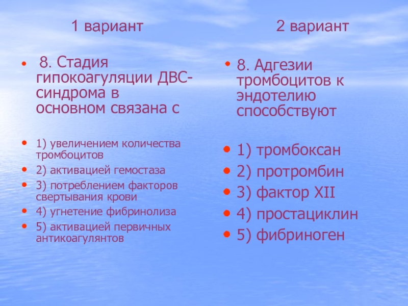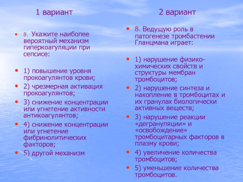 Слайд 1108. Укажите наиболее вероятный механизм гиперкоагуляции при сепсисе: