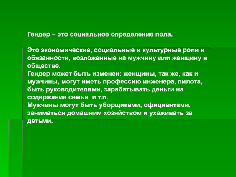 Гендер может быть изменен: женщины, так же, как и мужчины, могут иметь профессию инженера, пилота, быть руководителями, зарабатывать деньги на содержание семьи и т.п.