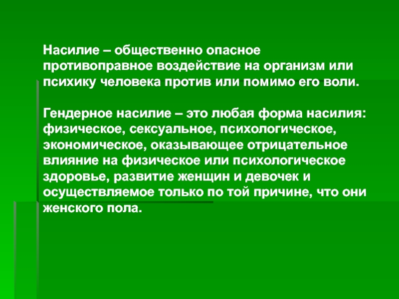 Слайд 20Насилие – общественно опасное противоправное воздействие на организм или психику