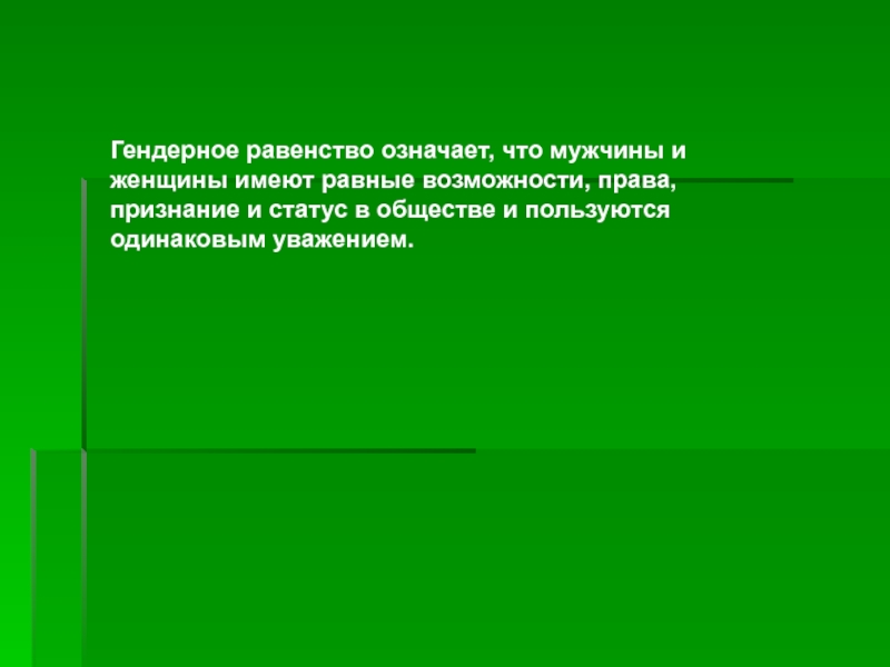 Слайд 18Гендерное равенство означает, что мужчины и женщины имеют равные возможности,