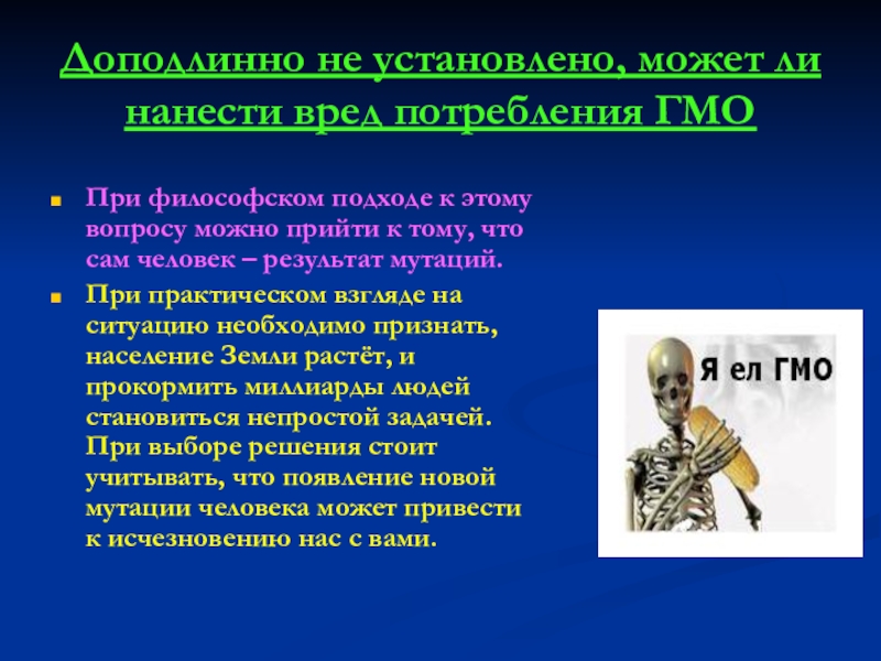 Слайд 18Доподлинно не установлено, может ли нанести вред потребления ГМО