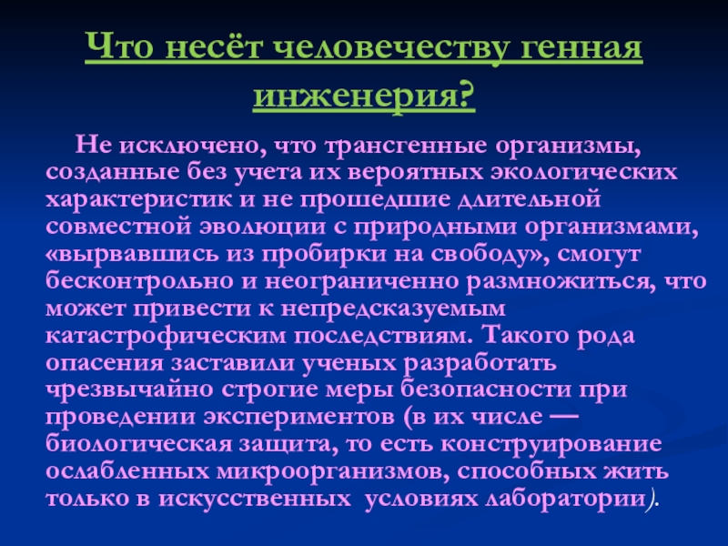 характеристик и не прошедшие длительной совместной эволюции с природными организмами, «вырвавшись из пробирки на свободу», смогут бесконтрольно и неограниченно размножиться, что может привести к непредсказуемым катастрофическим последствиям. Такого рода опасения заставили ученых разработать чрезвычайно строгие меры безопасности при проведении экспериментов (в их числе — биологическая защита, то есть конструирование ослабленных микроорганизмов, способных жить только в искусственных условиях лаборатории).