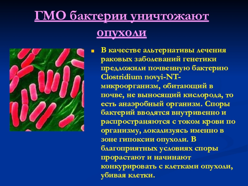 кислорода, то есть анаэробный организм. Споры бактерий вводятся внутривенно и распространяются с током крови по организму, локализуясь именно в зоне гипоксии опухоли. В благоприятных условиях споры прорастают и начинают конкурировать с клетками опухоли, убивая клетки.