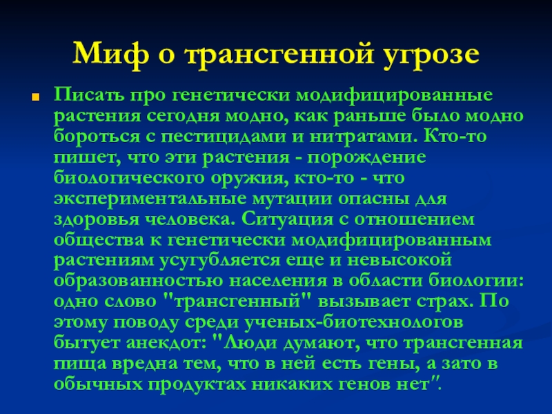 пишет, что эти растения - порождение биологического оружия, кто-то - что экспериментальные мутации опасны для здоровья человека. Ситуация с отношением общества к генетически модифицированным растениям усугубляется еще и невысокой образованностью населения в области биологии: одно слово "трансгенный" вызывает страх. По этому поводу среди ученых-биотехнологов бытует анекдот: "Люди думают, что трансгенная пища вредна тем, что в ней есть гены, а зато в обычных продуктах никаких генов нет".