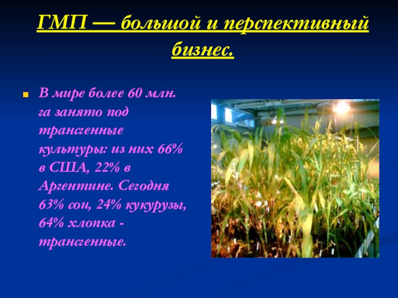 22% в Аргентине. Сегодня 63% сои, 24% кукурузы, 64% хлопка - трансгенные.