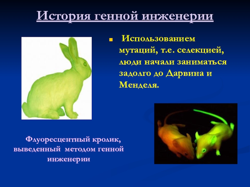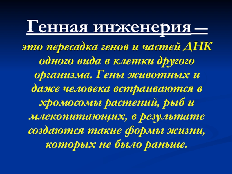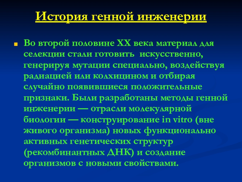 и отбирая случайно появившиеся положительные признаки. Были разработаны методы генной инженерии — отрасли молекулярной биологии — конструирование in vitro (вне живого организма) новых функционально активных генетических структур (рекомбинантных ДНК) и создание организмов с новыми свойствами.