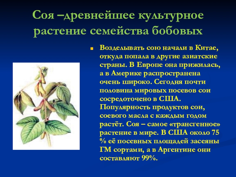 а в Америке распространена очень широко. Сегодня почти половина мировых посевов сои сосредоточено в США. Популярность продуктов сои, соевого масла с каждым годом растёт. Соя – самое «трансгенное» растение в мире. В США около 75 % её посевных площадей засеяны ГМ сортами, а в Аргентине они составляют 99%.